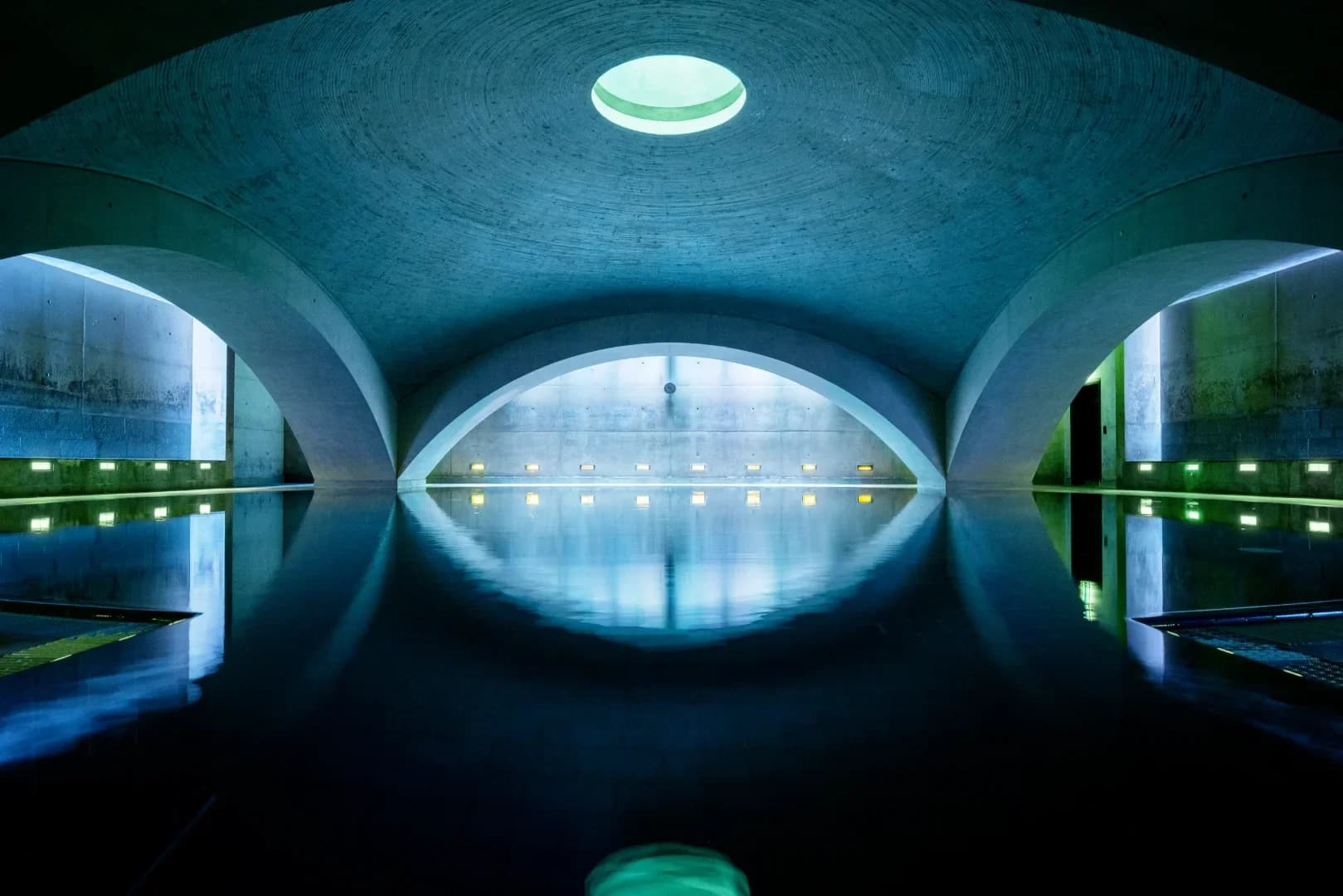At the heart of LIQUIDROM lies a domed hall housing a 36°C saltwater pool illuminated by shifting lights and accompanied by underwater music. This architectural centerpiece offers a tranquil yet immersive environment where sound and water interact. The design draws inspiration from nearby cultural landmarks such as the Tempodrom, emphasizing Berlin’s blend of modernism and creativity.