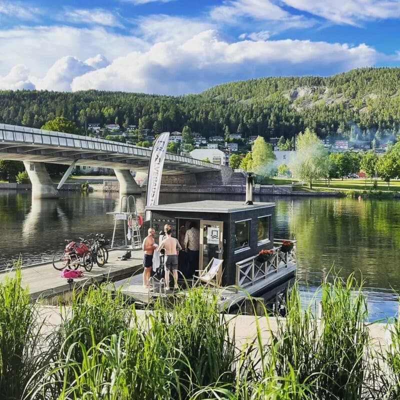Ælvebadstua is a floating sauna and wellness venue situated by the Drammenselva River at Pir 7 in Drammen, Norway. It offers visitors a tranquil setting that combines modern Nordic design with natural riverfront surroundings, emphasizing relaxation, social connection, and year-round outdoor bathing experiences.