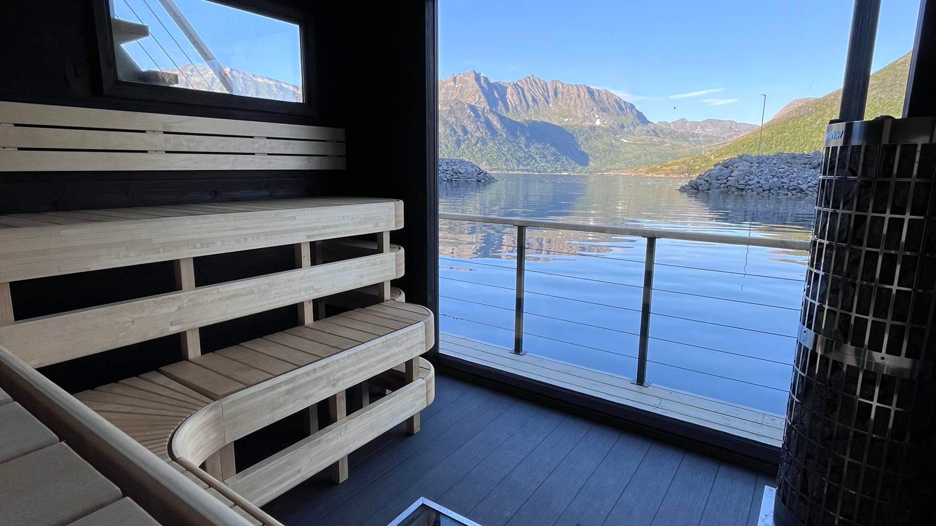 Hands down best sauna experience in Senja! Beautiful design where you can see the fish swim around beneath you while relaxing, incredible contrasting colours of light wood, black walls and turquoise ocean, amazing views, and nothing beats jumping straight into a Norweigan fjord to cool down!!