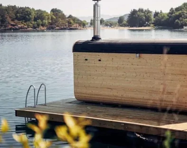 Saga, the so called "hidden pearl," is a delightful surprise nestled in an urban bay near Sandnes, a truly unique floating sauna placed thoughtfully between industry and buildings. It provides a sanctuary for up to ten people looking for a complete waterborne experience.
